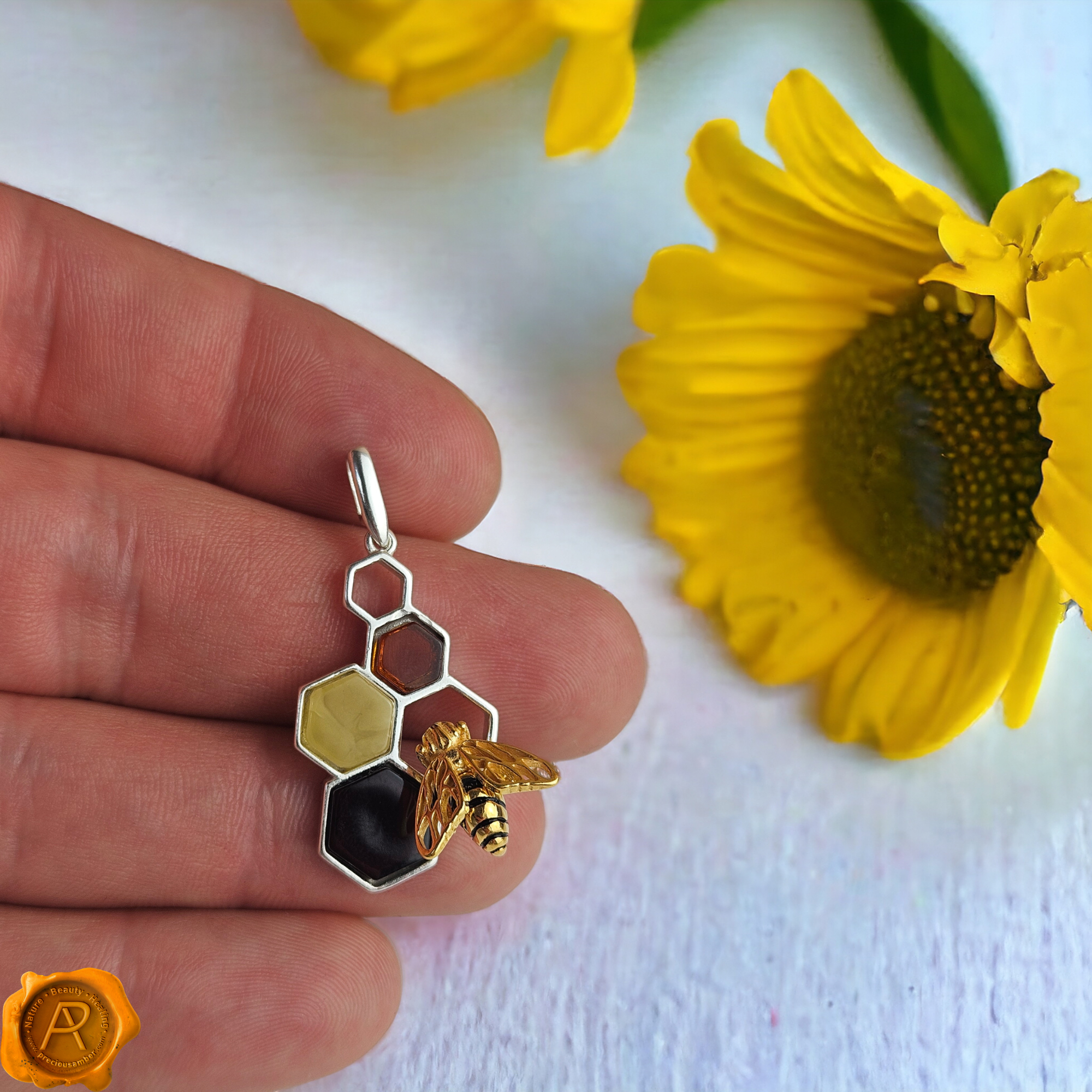 Embrace the delicate beauty of nature with our exquisite pendant featuring a charming 18K gold-plated bee delicately poised on a honeycomb. Crafted with precision and care, the intricate honeycomb design is adorned with white butterscotch, cherry and honey Baltic Amber, each piece a testament to the wonders of the natural world. Cherry Amber appears almost black until a bit of light catches the bead creating a dark burgundy hue. Set in high-quality 925 hallmarked silver, this pendant exudes elegance and craftsmanship, making it a timeless addition to any jewellery collection. Let the subtle buzz of the bee and the warmth of Amber inspire your style and ignite your imagination. Comes beautifully presented in our signature luxurious grey charcoal Precious Amber jewellery gift box.