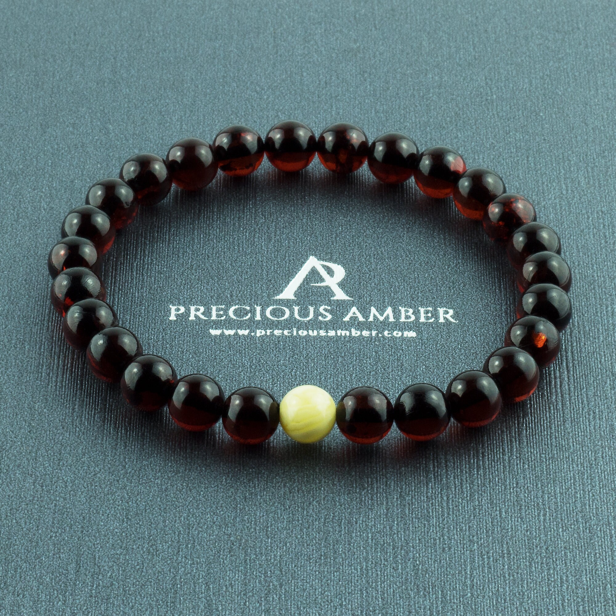 Unisex black Amber bracelet observes perfectly rounded rare cherry with white Baltic Amber threaded on elastic cotton to last years of use. Appearing almost black until a bit of light catches the beads creating a dark burgundy hue. Handcrafted to a standard of perfection will make a meaningful nature-inspired gift or just a wonderful love token for yourself or your special someone. Wrapped up with love in a luxury gift box.
