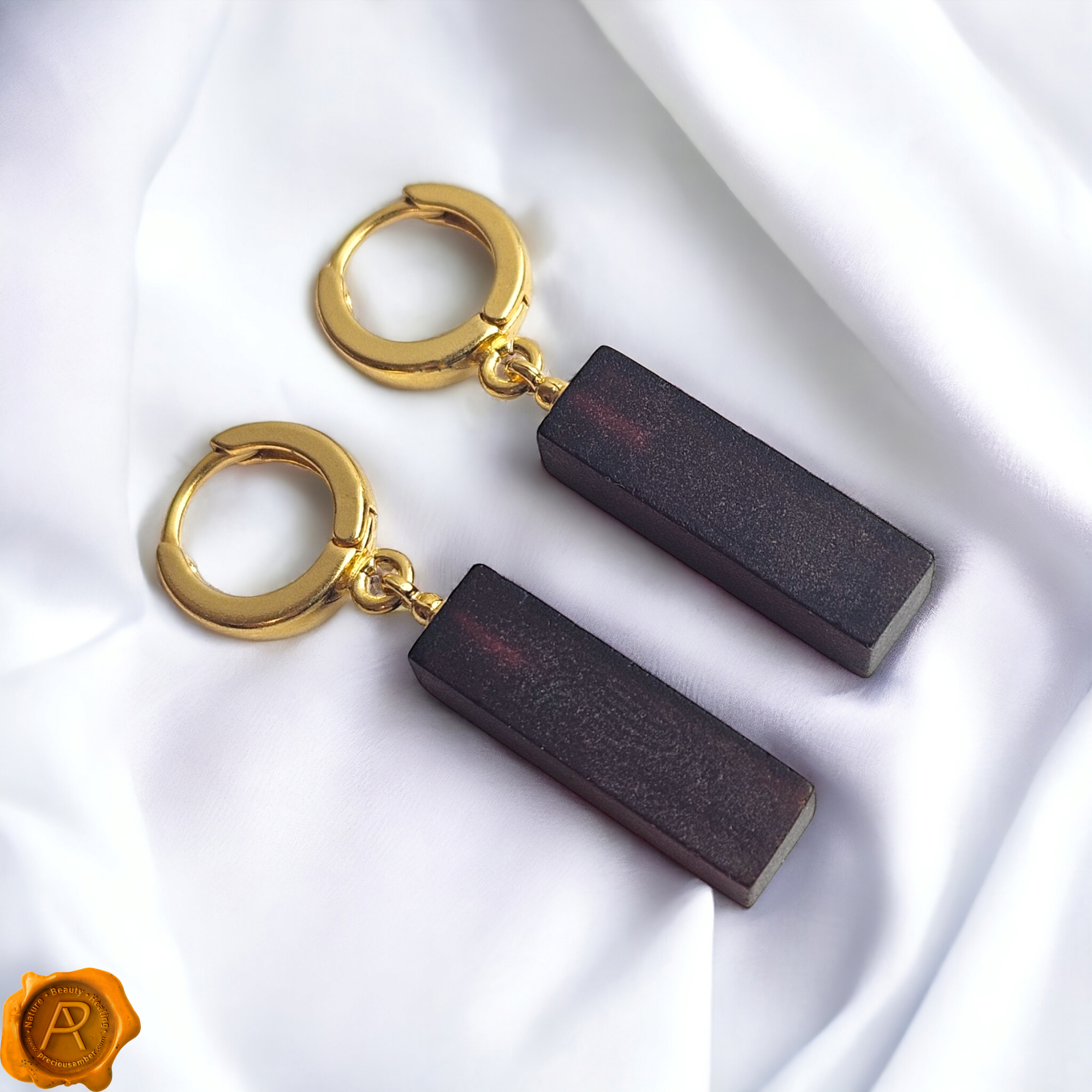 These elegant cherry Amber earrings are a true testament to natural beauty and geometric design. Appearing almost black until a bit of light catches the beads, creating a dark burgundy hue. The Amber is meticulously shaped into geometric rectangles, a form that highlights the organic texture and intrinsic patterns within. The earrings are adorned with 925 Hallmarked Silver and 18K Gold plated latch back closure, providing a luxurious sheen that contrasts beautifully with the warm tones of the Amber, ensuring that these stunning pieces are secure and comfortable to wear. Ideal for adding a sophisticated and earthy touch to any ensemble, these earrings celebrate the fusion of raw natural elements with refined elegance. Comes beautifully presented in our signature luxurious grey charcoal Precious Amber jewellery gift box.