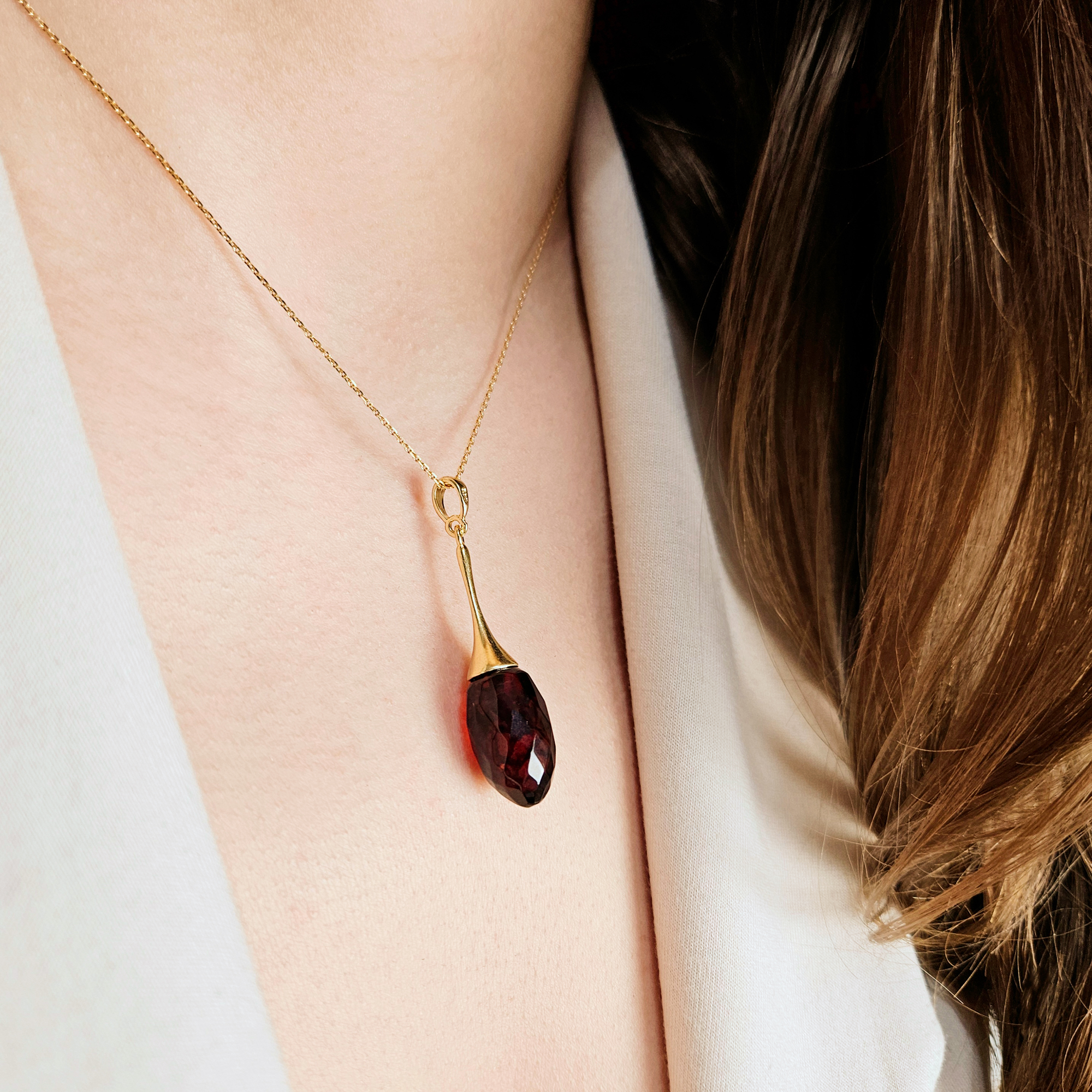 A statement of timeless elegance, this luxurious amber pendant features a long, faceted teardrop of cherry Baltic Amber. Each piece is hand-selected for its rare, inky depth. Dark as night, the cherry Amber reveals a rich burgundy glow when touched by light, shimmering like wine in candlelight. Precision-cut facets enhance its natural, mysterious beauty, lending it a subtle and dramatic sparkle.