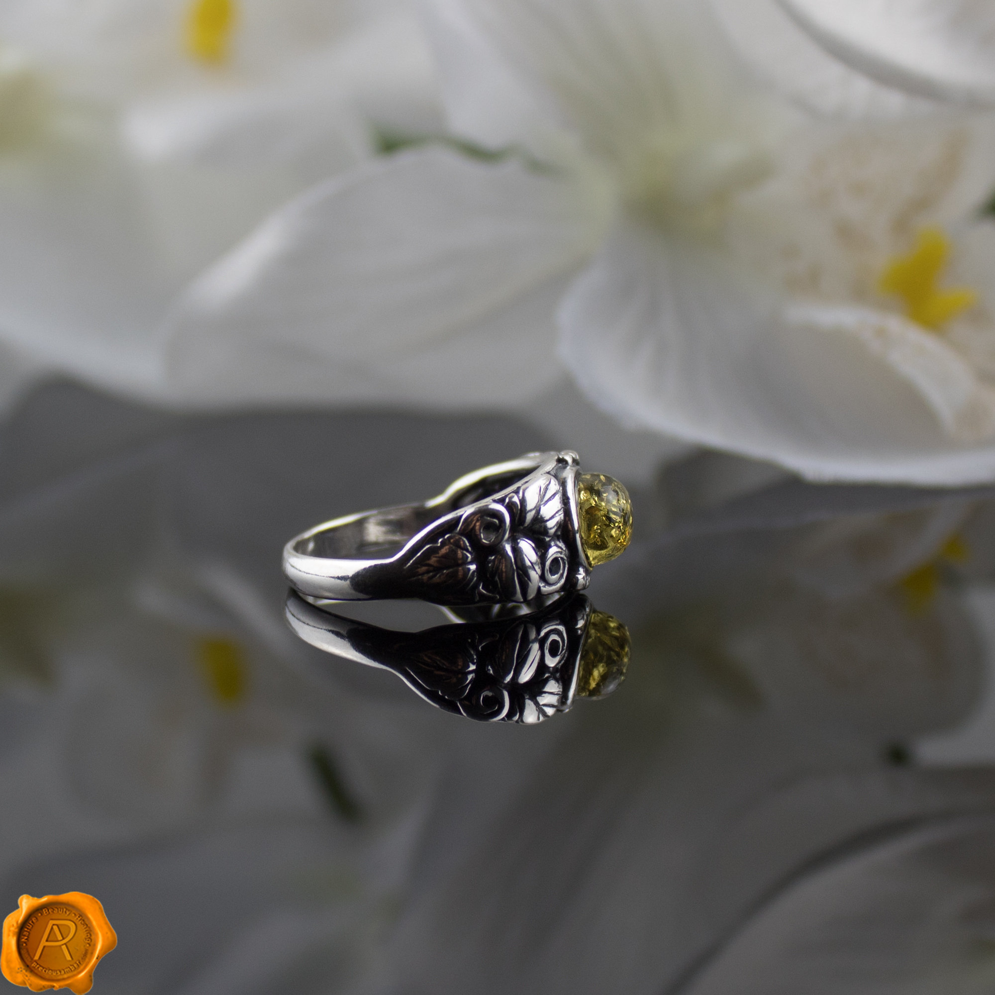 “Green is the prime colour of the world, and that from which its loveliness arises” Renewing – Refreshing – Regenerating. It represents balance, growth, learning, and harmony. Green Amber is rare and accounts for only 2% of all Amber found. Let your hands do the talking with this finely detailed silver floral ring. Features perfectly crafted green Baltic Amber hand-hammered in 925 Hallmarked Silver. Handcrafted to a standard of perfection will make a unique promise ring, a great birthstone ring, or just a wonderful love token for yourself or your special someone. Wrapped up with love in a luxury gift box.