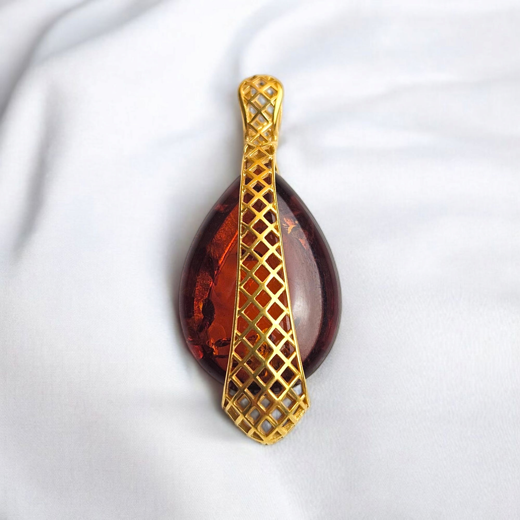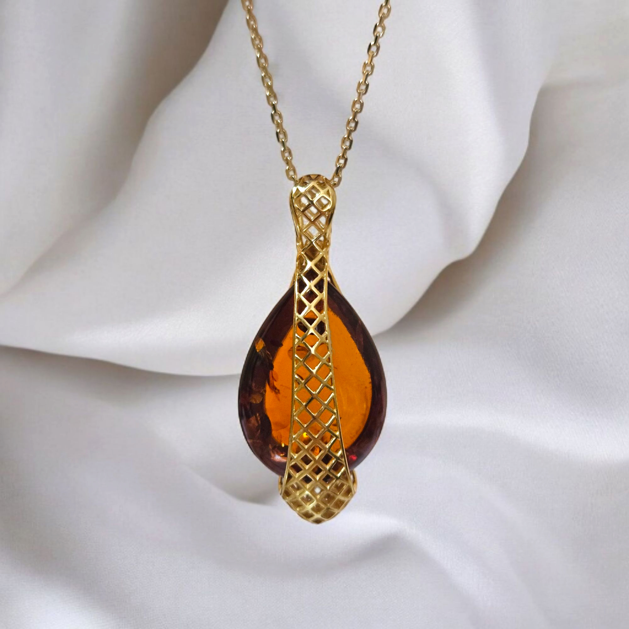 Timeless and elegant, this honey Baltic amber pendant is a radiant symbol of nature’s warmth. Suspended within a premium hallmarked silver setting, the abstract 18K gold-plated design flows around the teardrop like liquid fire. The 6mm bail space lets you pair it with your favorite chain, making it a versatile and personal statement piece. A true blend of artistry and nature, this pendant is perfect for those who appreciate unique, organic beauty. Comes beautifully presented in our signature luxurious charcoal grey Precious Amber jewellery gift box. Ready to delight!