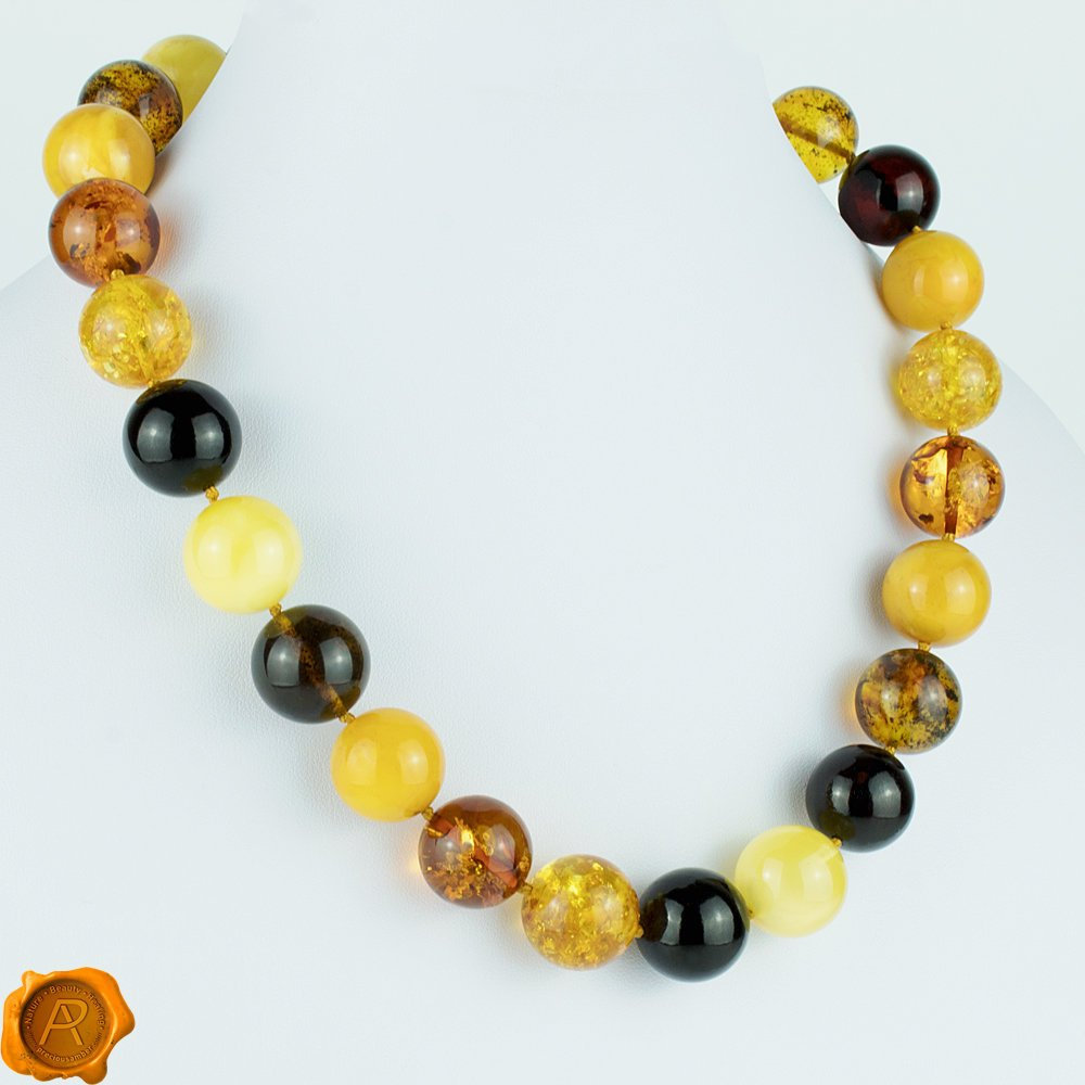 One of a kind amber necklace beholds carefully selected flawlessly crafted 20mm multicolour amber beads threaded on cotton to last years of use. Rhodium-plated lobster claw closure ensures a secure and comfortable fit. Rhodium plating helps enhance the lustre of popular metals. Besides, it adds smoothness and a shiny finish to jewellery materials. Rhodium is a precious metal, a member of the platinum family with a platinum, silver hue that is reflective and resistant to corrosion and tarnishing. The necklace consists of rare cherry and beeswax, lemon, cognac, and butterscotch Baltic Amber. Earthy remains preserved in amber will make a real talking point for the wearer. Handcrafted to a standard of perfection, this captivating amber necklace is sure to become a treasured keepsake. Presented in a luxury gift box.