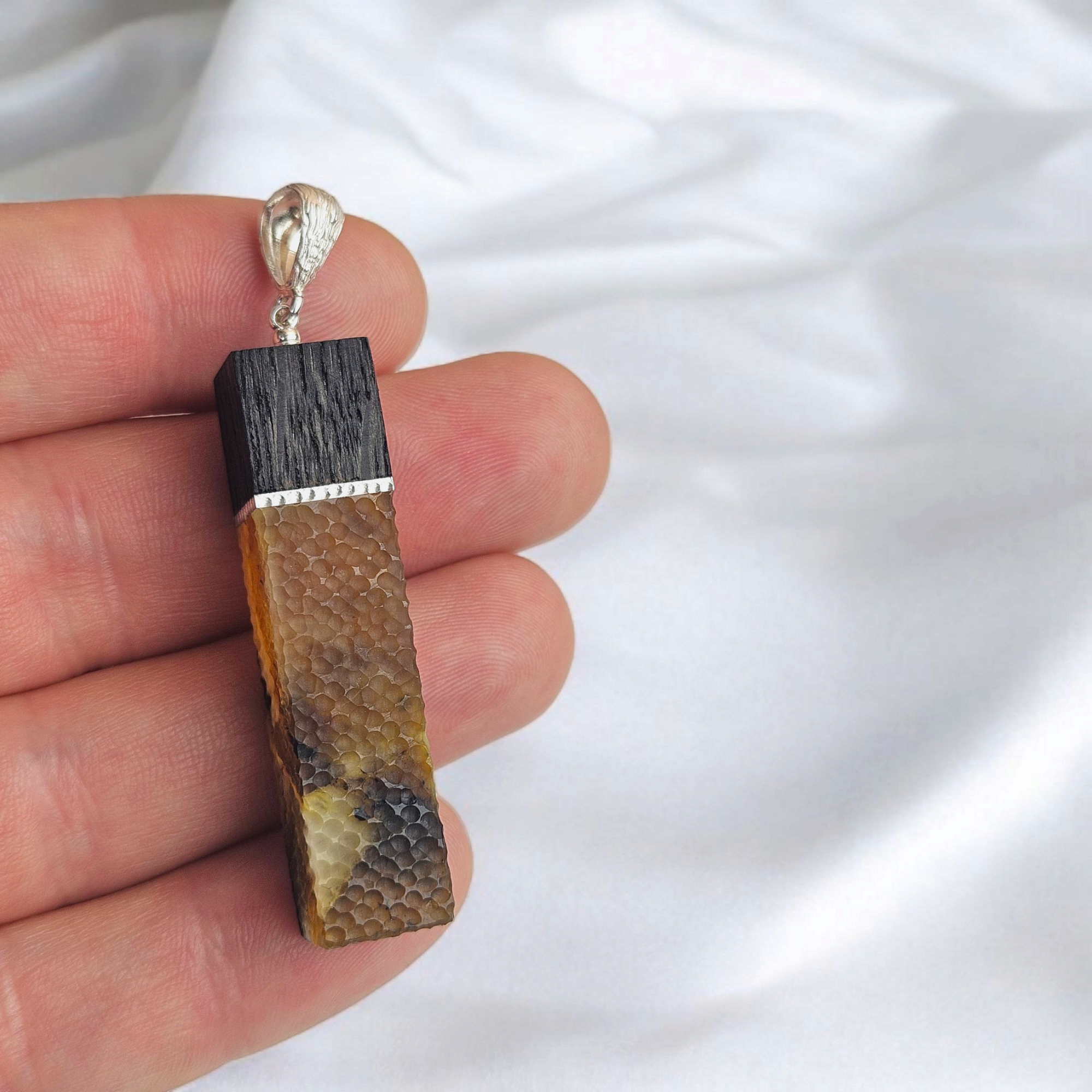 - Command attention with this striking unisex marble amber pendant, where nature meets cosmic beauty. The large, hand-carved rectangular amber is engraved to resemble a meteor, with deep textures and organic patterns that catch the light from every angle. This pendant is a true fusion of earth and sky, encased in sterling silver accents and complemented by rare swamp black oak.