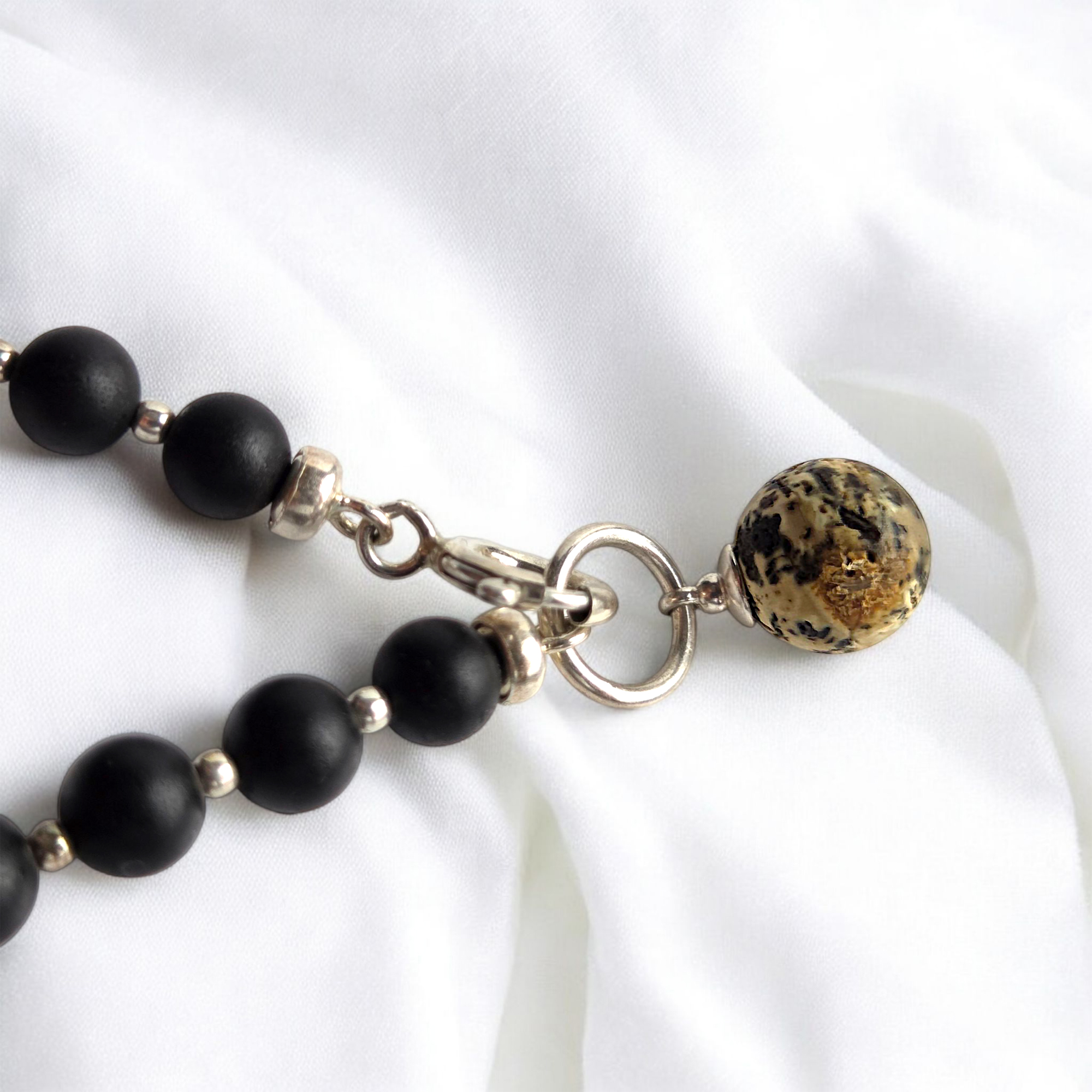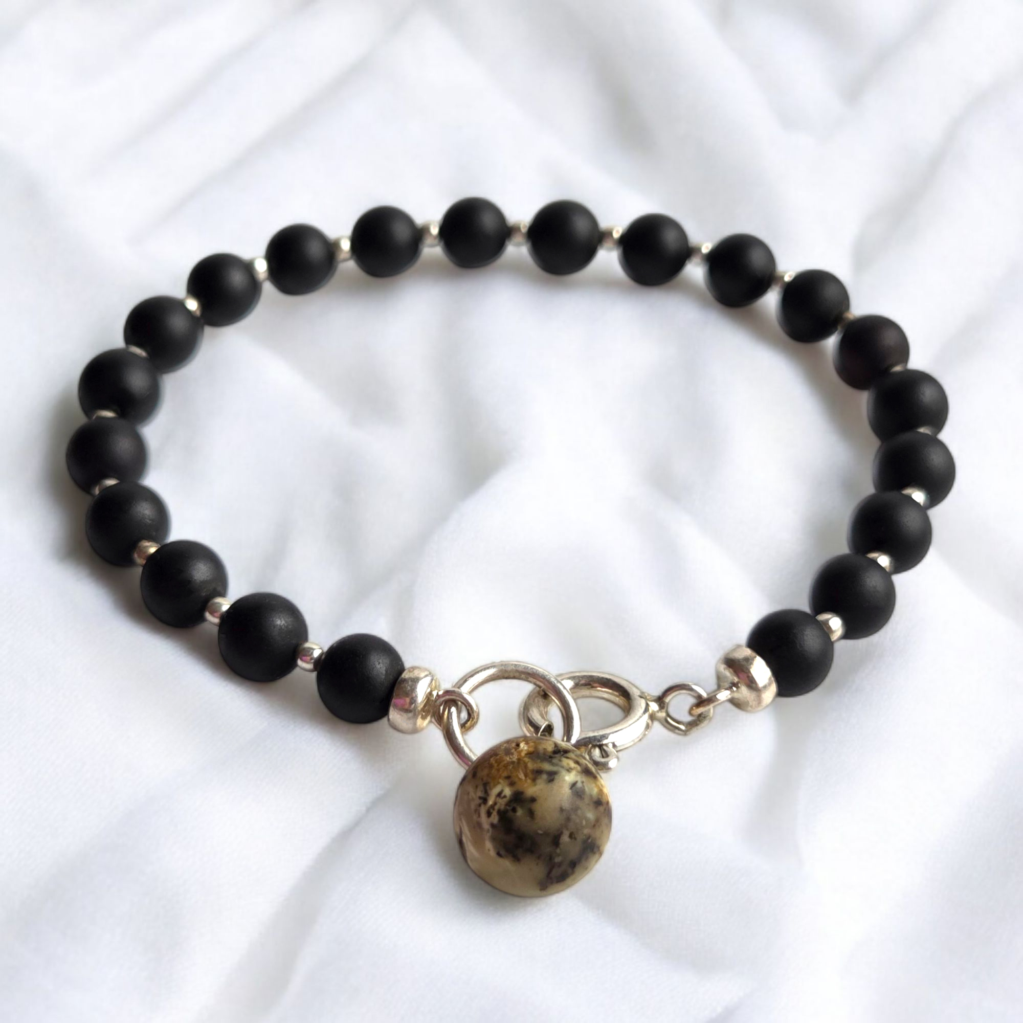 Elevate your style with this minimalist black Amber bracelet. Matte black amber beads meet sterling silver spacers for a bold, contemporary contrast. A rare marble sphere charm and interlocking rings represent unity and enduring connection, giving the piece a striking, meaningful edge. Packaged in our signature charcoal grey Precious Amber jewellery box, it’s the perfect statement accessory or gift for someone who loves modern sophistication.